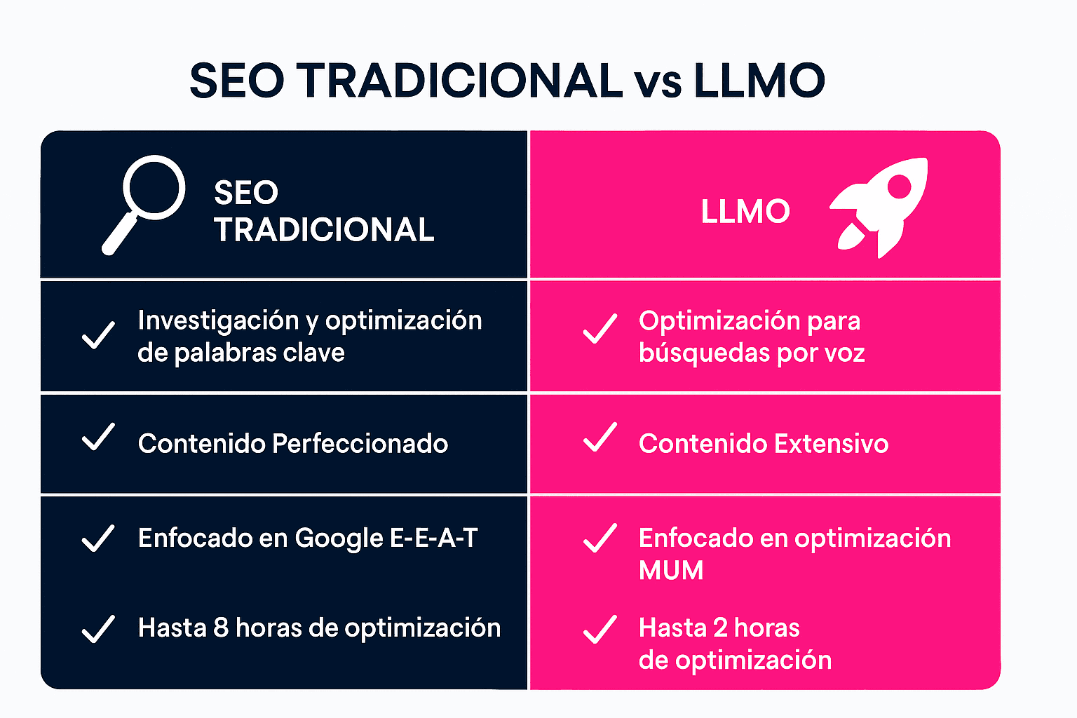 El SEO tradicional se enfoca en satisfacer algoritmos de motores de búsqueda como Google, utilizando keywords, meta tags y enlaces. La optimización LLMO (Large Language Model Optimization) va más allá: prepara el contenido para ser interpretado y citado por modelos de IA como ChatGPT o Bard. Esto requiere respuestas directas, contexto claro y estructura conversacional que los LLMs puedan procesar eficientemente.
